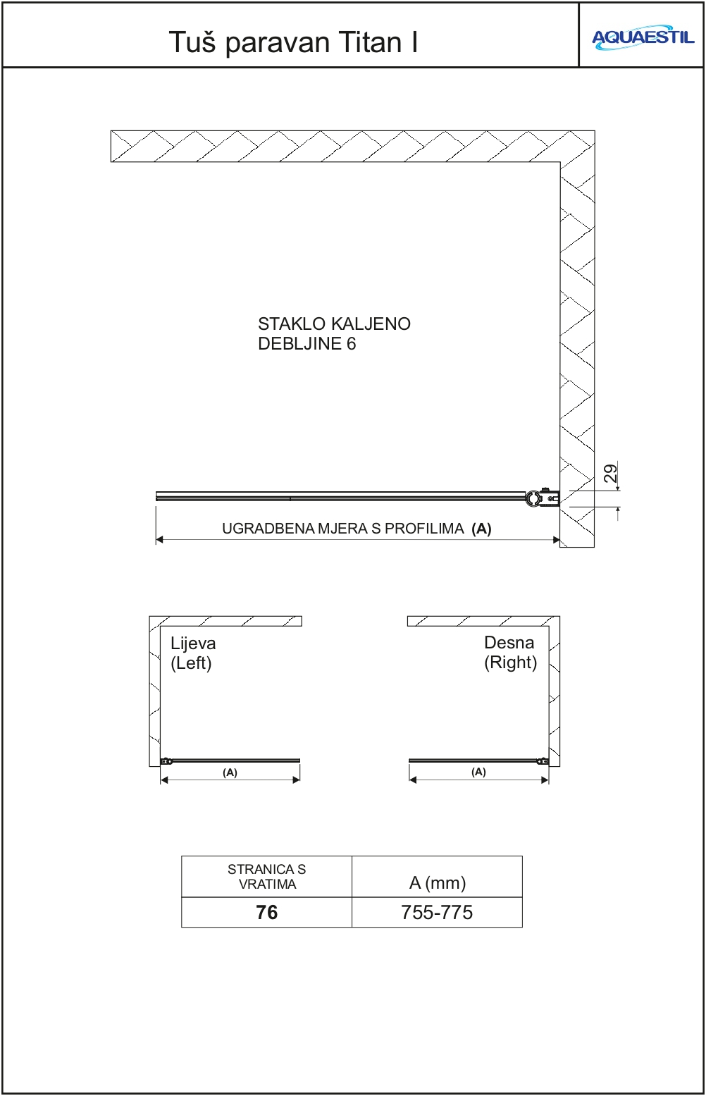Titan I ist eine universelle Duschwand mit einem Flügel, die für Badewannen geeignet ist. Da sie universell ist, muss man in der Ausführung mit transparentem Glas nicht in Voraus wissen, auf welche Wand sie montiert wird. Dies ist sehr praktisch bei dem Einbau in Appartements und Hotels, wo die genaue Position der Bdewanne oft nicht im Voraus bekannt ist. Doch insofern es Reliefglas und nicht transparentes Glas ist, so ist es wegen der richtigen Orientierung des Reliefs notwendig, die richtige Einbauposition zu definieren. Die Duschwan kann in beide Richtungen umgeklappt werden. Das Glas ist mit einer Beschichtung gegen Kalk behandelt worden, ohne zusätzliche Kosten.