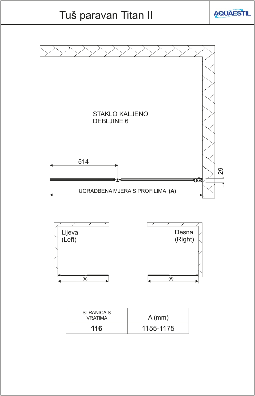 Titan II ist eine universelle Duschwand mit einem Flügel, die für Badewannen geeignet ist. Da sie universell ist, muss man in der Ausführung mit transparentem Glas nicht in Voraus wissen, auf welche Wand sie montiert wird. Dies ist sehr praktisch bei dem Einbau in Appartements und Hotels, wo die genaue Position der Bdewanne oft nicht im Voraus bekannt ist. Doch insofern es Reliefglas und nicht transparentes Glas ist, so ist es wegen der richtigen Orientierung des Reliefs notwendig, die richtige Einbauposition zu definieren. Die Duschwan kann in beide Richtungen umgeklappt werden. Das Glas ist mit einer Beschichtung gegen Kalk behandelt worden, ohne zusätzliche Kosten.