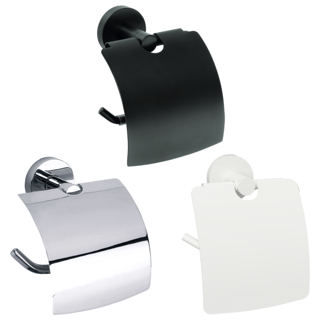 Držalo za toaletni papir s pokrovom, iz medenine v kromiranem, belem mat ali črnem mat učinku.