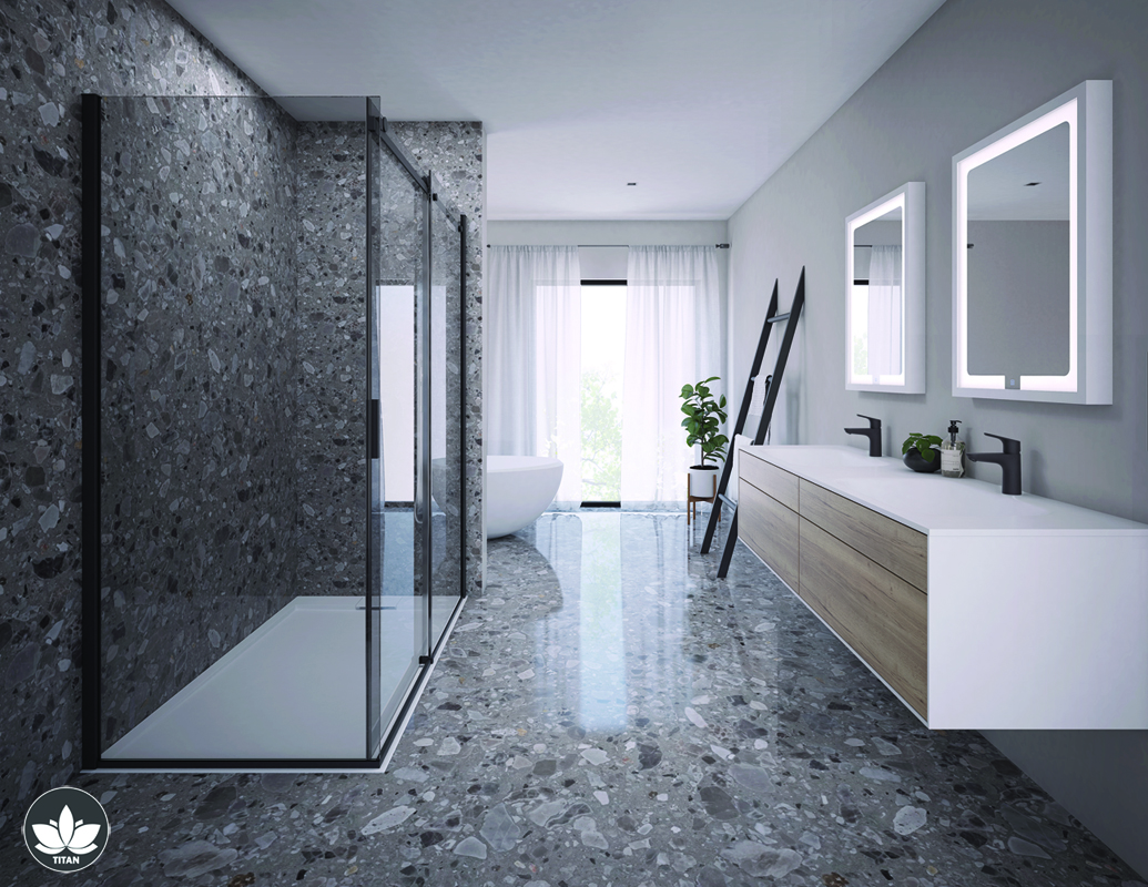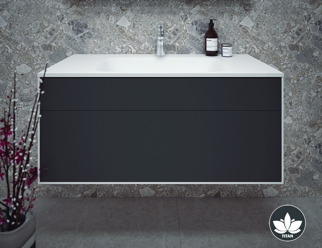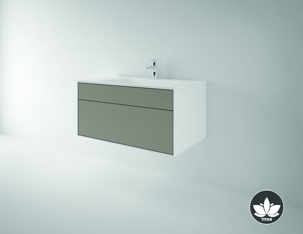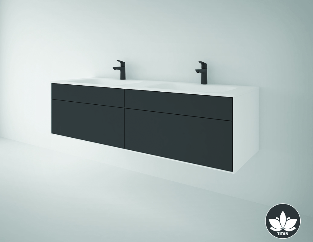 The Titan I premium bathroom furniture consists of a single or double basin and a vanity unit made of the ASTONE composite material, with a front comprising one or two drawers available in a variety of colours and styles.