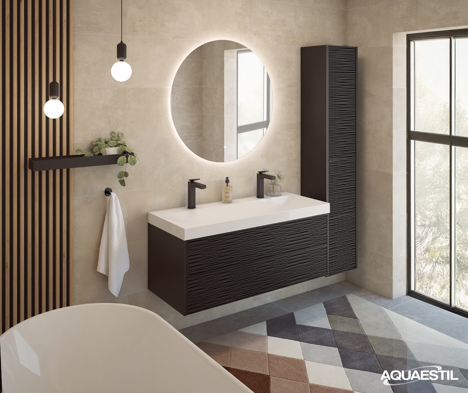 Linija Myra donosi sofisticiran dizajn s prepoznatljivim 3D reljefnim frontama u prugastom ili rebrastom uzorku. Veliki, minimalistički oblikovan umivaonik tankih rubova, opremljen poklopcem odvoda u efektu površine, dodatno naglašava suvremenu eleganciju elemenata ove linije.
