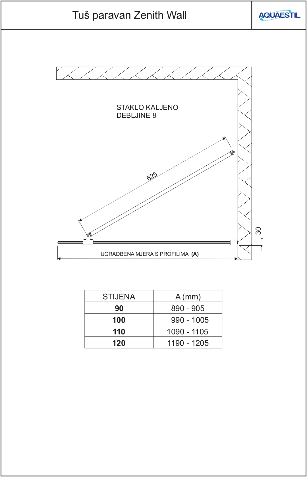 - Paravan Zenith Wall dostupan je i u varijanti s kutnim fiksatorom u rasponu dimenzija od 90 do 120 cm širine*